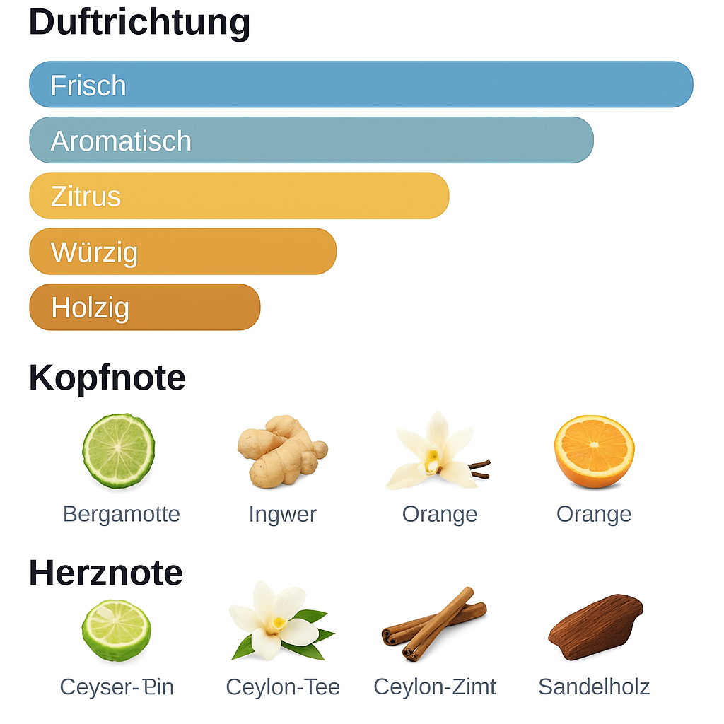 der mit frischem Bergamottenschimmer und zartem Neroli beginnt, sich im Herzen in warmem schwarzem Tee und sanfter Iris entfaltet und in der Basis mit samtigem Amberholz und hauchzartem Moschus schwebt elegant, zeitlos und unwiderstehlich.
