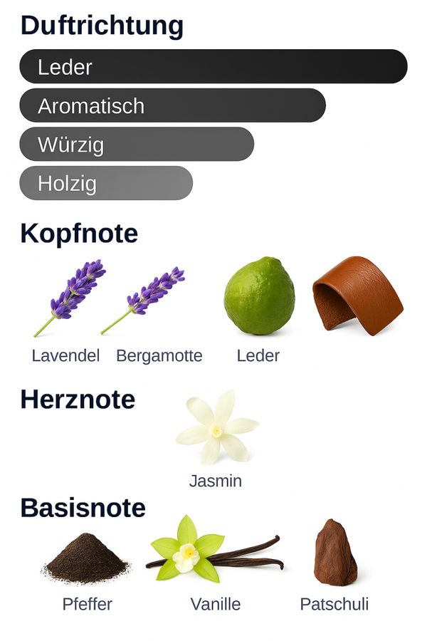 der mit kraftvollem schwarzem Leder und würzigem Kardamom eröffnet,