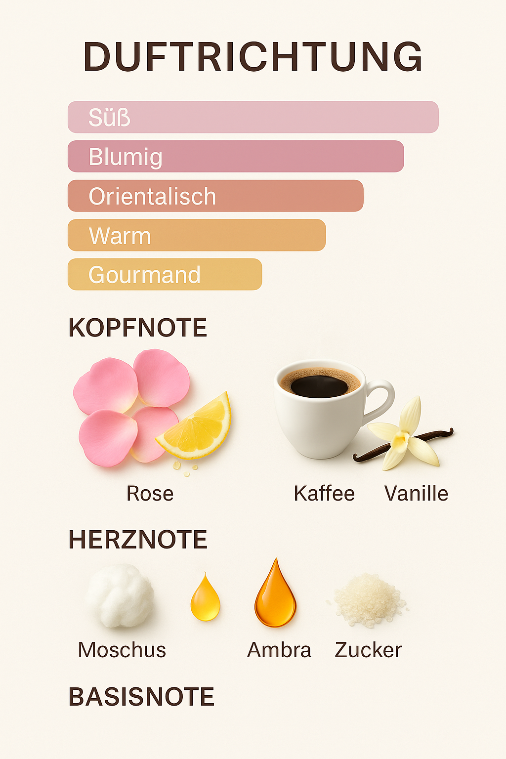 sich im Herzen mit süßem Gebäck, feiner Vanille und weichem Moschus entfaltet,